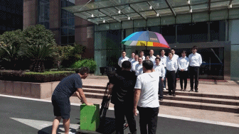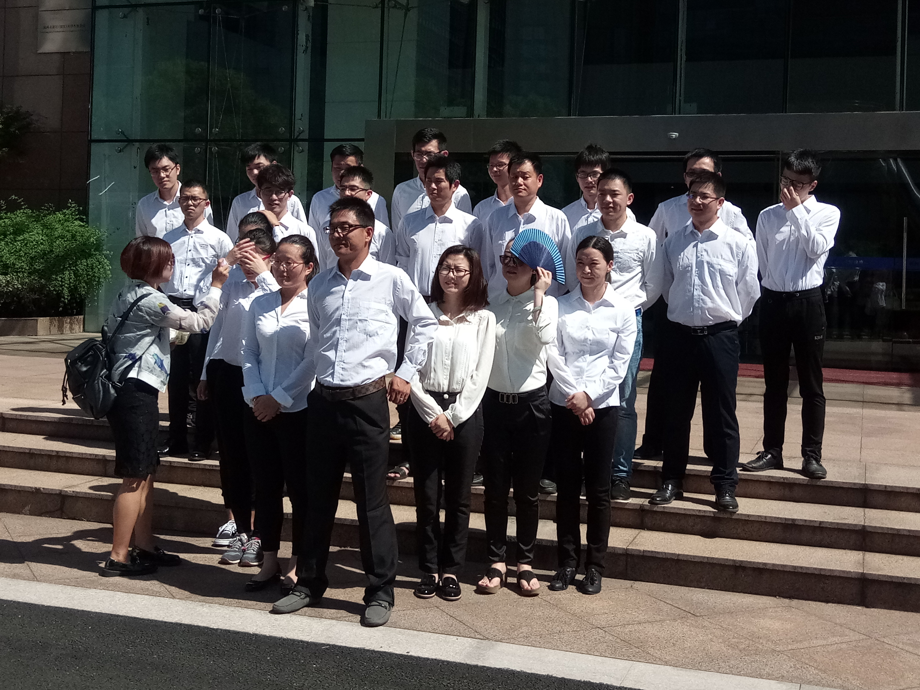 當天上午一大早,同事們已經做好了拍攝的準備工作,換好衣服,化好妝,長發扎起。雖是早上,太陽的威力可一點不弱,同事們長衣長褲站在太陽底下,從鏡頭里看起來很專業干練,但那滋味真是——誰曬誰知道,雙眼皮里都是汗水。在太陽下站一會兒,就覺得皮膚發燙,加上穿著黑色長褲黑皮鞋,格外吸熱。