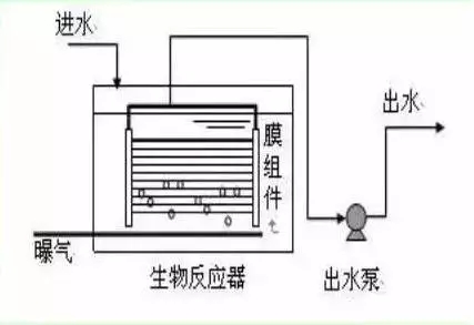 把膜組件置于生物反應(yīng)器內(nèi)部。進(jìn)水進(jìn)入膜--生物反應(yīng)器,其中的大部分污染物被混合液中的活性污泥去除,再在外壓作用下由膜過濾出水。