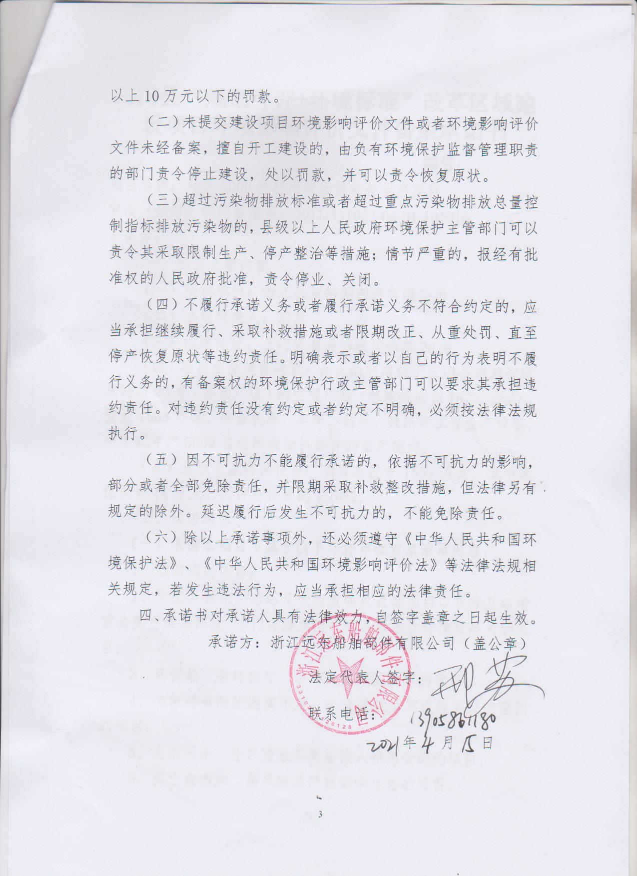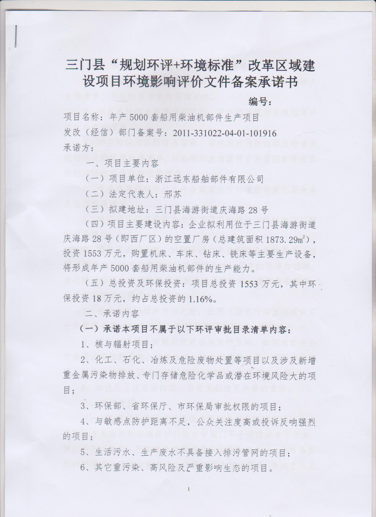 浙江遠東船舶部件有限公司年產5000套船用柴油機部件生產項目環境影響登記表(區域環評+環境標準)