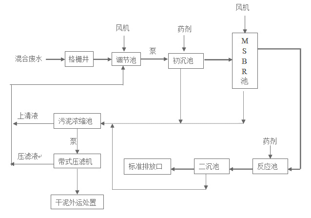 混合廢水經(jīng)格柵井隔去粗大雜物后進(jìn)調(diào)節(jié)池,廢水在調(diào)節(jié)池內(nèi)借助空氣攪拌實(shí)現(xiàn)均質(zhì)、調(diào)節(jié)水量并使廢水降溫后通過(guò)廢水提升泵提升到初沉池,經(jīng)投加混凝劑及助凝劑使廢水中所含的大部分SS和部分色度得以去除,初沉池出水進(jìn)入A池,在缺氧狀態(tài)下大分子有機(jī)物經(jīng)水解分解成小分子有機(jī)物,提高廢水的可生化性,廢水在O池進(jìn)行好氧生物處理后,混合液進(jìn)入SBR池,出水自流入反應(yīng)池,經(jīng)加藥反應(yīng)后進(jìn)入二沉池進(jìn)行泥水分離,去除大部分色度和部分CODcr,二沉池出水通過(guò)標(biāo)準(zhǔn)化排放井達(dá)標(biāo)排放。沉淀污泥進(jìn)入污泥濃縮池,污泥濃縮池污泥通過(guò)污泥泵進(jìn)入污泥脫水機(jī)械,經(jīng)脫水后干泥制磚或填埋。
